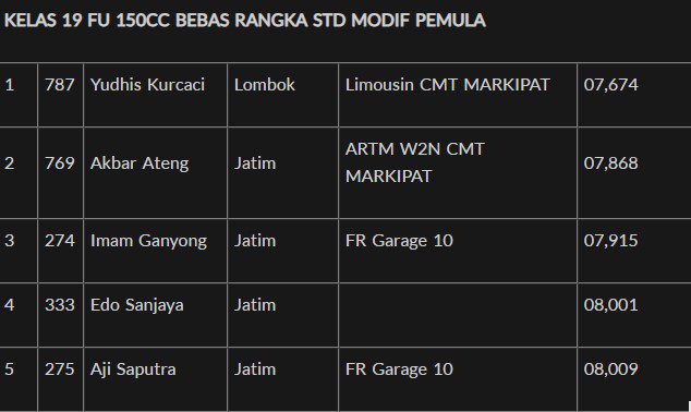 Balap Hasil Juara Black Dragbike 2023 5 Agustus Sidoarjo 6 Agustus 2023 Naila Athiyyah 2902 Views Laman: 1 2 3 4 5 6